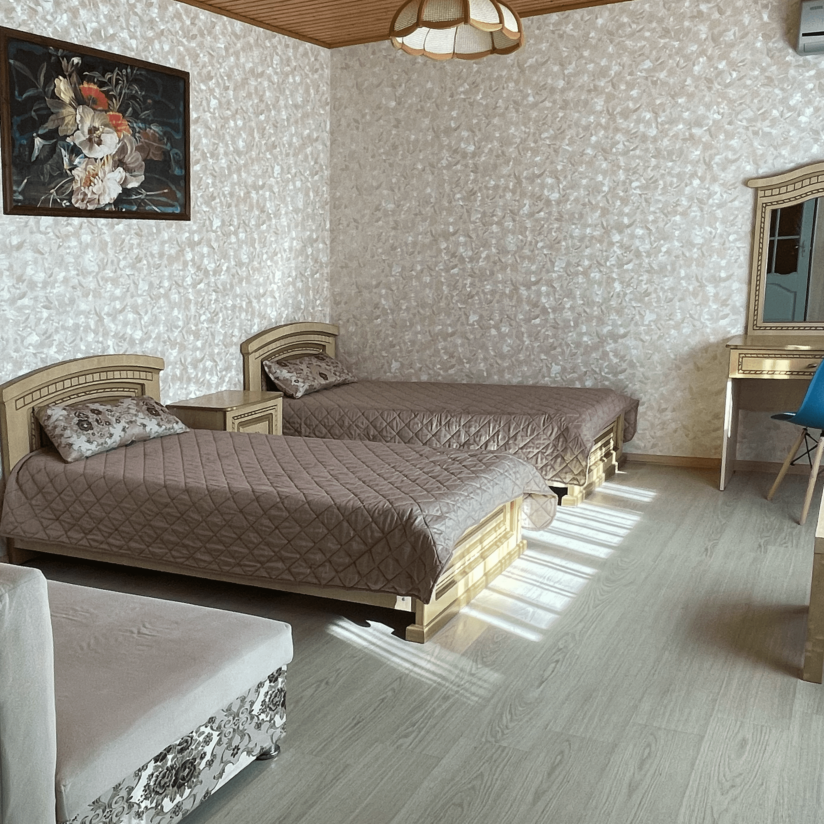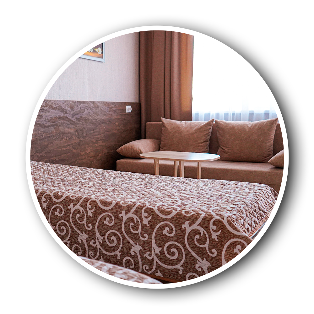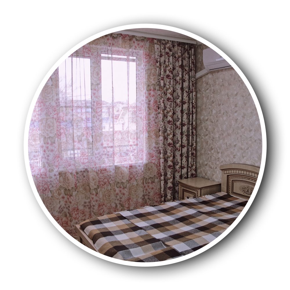 Уютный светлый номер со всеми удобствами на 1 этаже. Две односпальные кровати (или одна двуспальная кровать) и диван. В номере своя веранда, где можно провести время за теплой беседой со своей семьей.