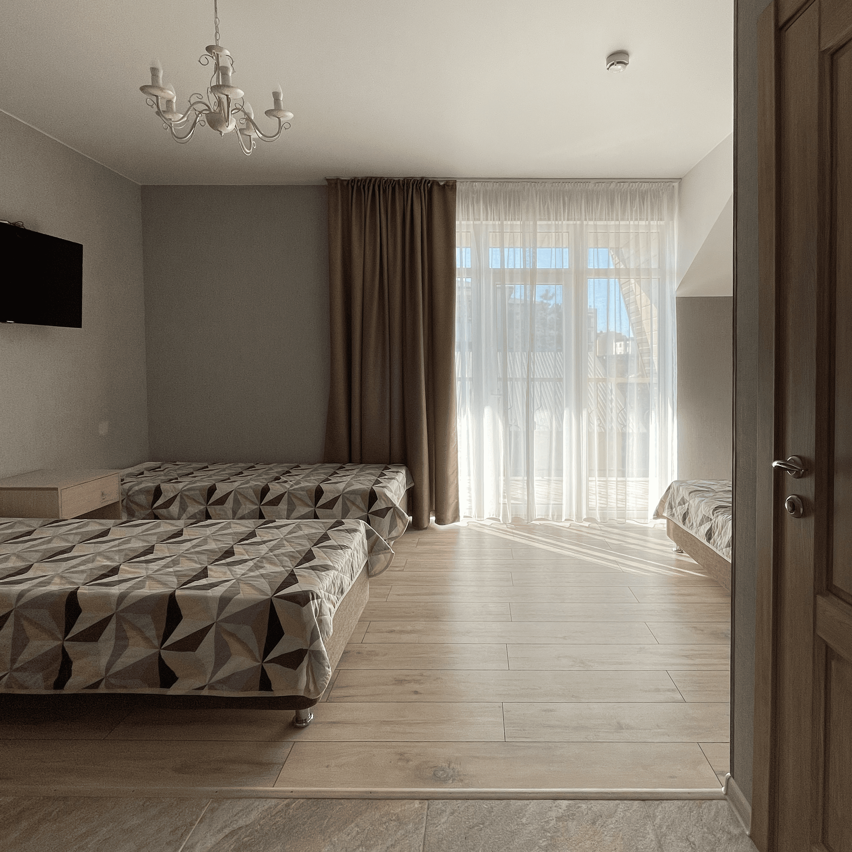 Уютный светлый номер со всеми удобствами на 2 этаже. Одна двуспальная кровать (или две односпальные) и раскладное кресло-кровать в качестве дополнительного места. В номере свой балкон, где можно провести время за теплой беседой со своей семьей.